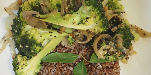 Wash and chop broccoli. Heat the oil and add curry leaves,cumin and mustard seeds. When the mustard seeds pop, add all the ingredients except the broccoli and cook for 1-2 minutes. Then add the broccoli and a little water and steam for 5-6 minutes until it is cooked but still crisp. Add salt to taste at the end. Serve with rice – I quite like red rice, as eaten in Bhutan. Commonly called Camargue rice in health-food shops.