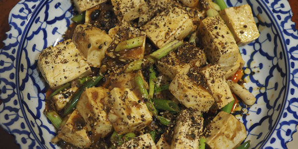 Pour tofu into a bowl, sprinkle with Sichuan pepper and serve with rice and greens. I served with a Vegetarian Pad Thai and some steamed pak choi with ginger.