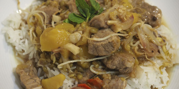 Add more oil if not enough, and then stir fry shallots for 2 minutes over moderate heat. Reduce heat and add the paste and stir fry for 2-3 minutes until aromatic. Add 150ml (5 fl oz) water, simmer and bring to the boil. Put the pork back in the pan with the the mango and tamarind water/paste and simmer for 10 minutes until the pork is really soft. Add the bean sprouts/bamboo shoots and cook for another couple of minutes.