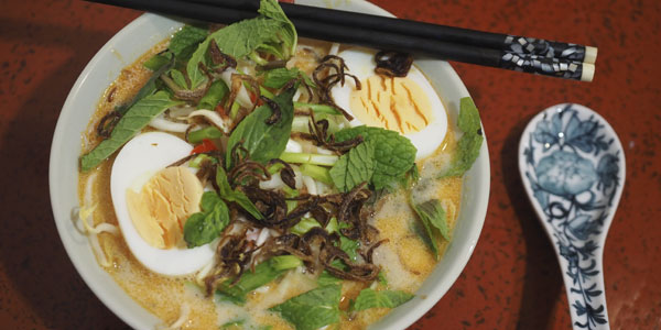 Add the coconut milk and cook for 4-5 minutes. While it’s cooking you can add hot water to the noodles so that they cook (check packet for precise timing, every noodle is different). Then divide noodles, prawns, tofu, equally between two bowls; top with bean-sprouts and hardboiled eggs. Check soup seasoning, then ladle boiling soup into the bowl. Garnish with spring onions, herbs and shallots. Eat with chopsticks AND a Chinese soup spoon. There’s no such thing as good manners in Chinese eating!