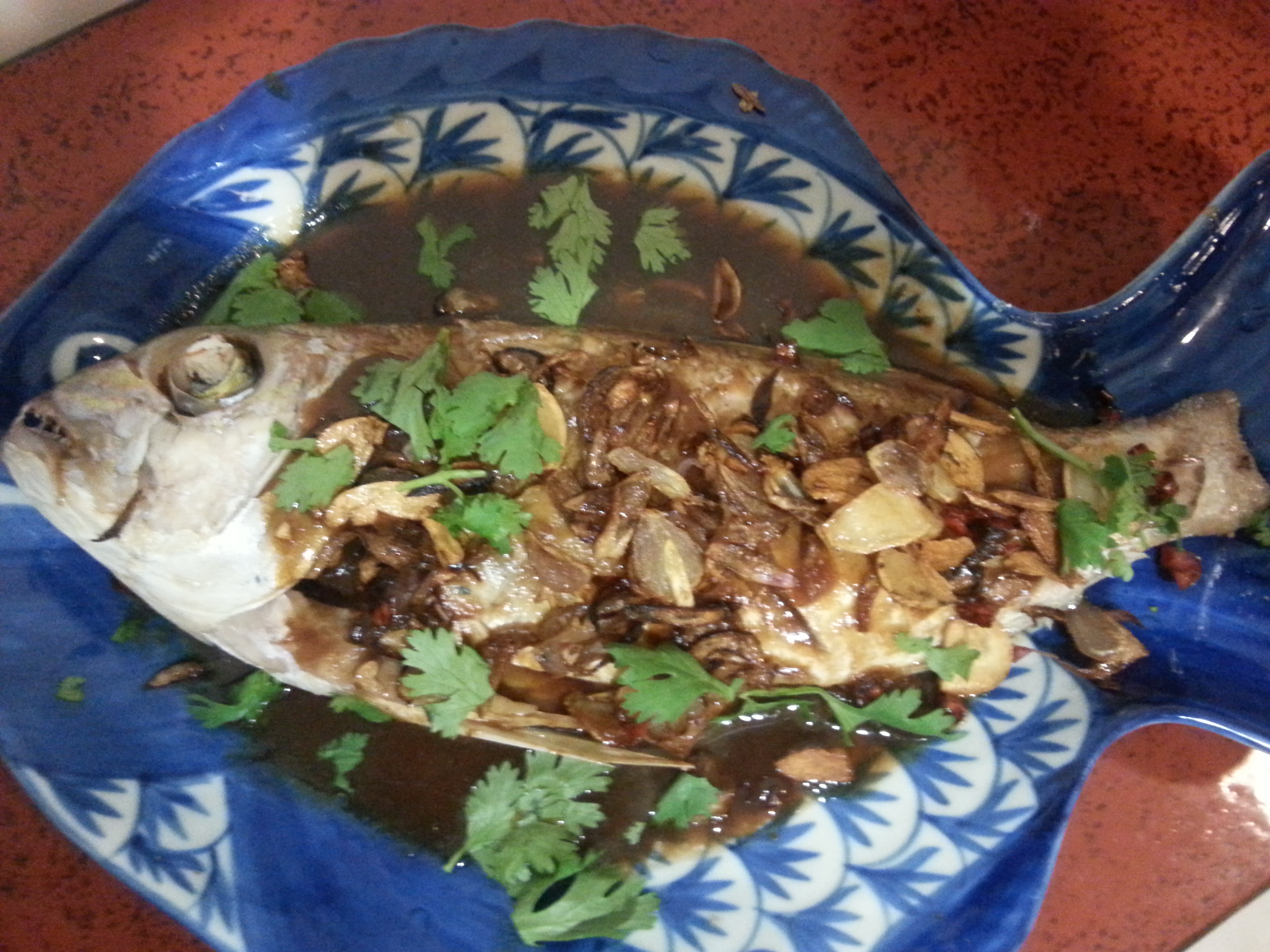 When we were in Myanmar, we had grilled white snapper, on the beach, every night. Imagine my joy to find whole white snapper here in Singapore! No BBQ here, though, so decided to roast the fish, although you could grill it too. Here I’ve used one small-ish fish for two people, but you could get a larger one, or cook several,depending on how many you are feeding (getting a big snapper might be difficult). You could use sea bass or sea bream instead, and if you have a BBQ, then it will be even tastier!