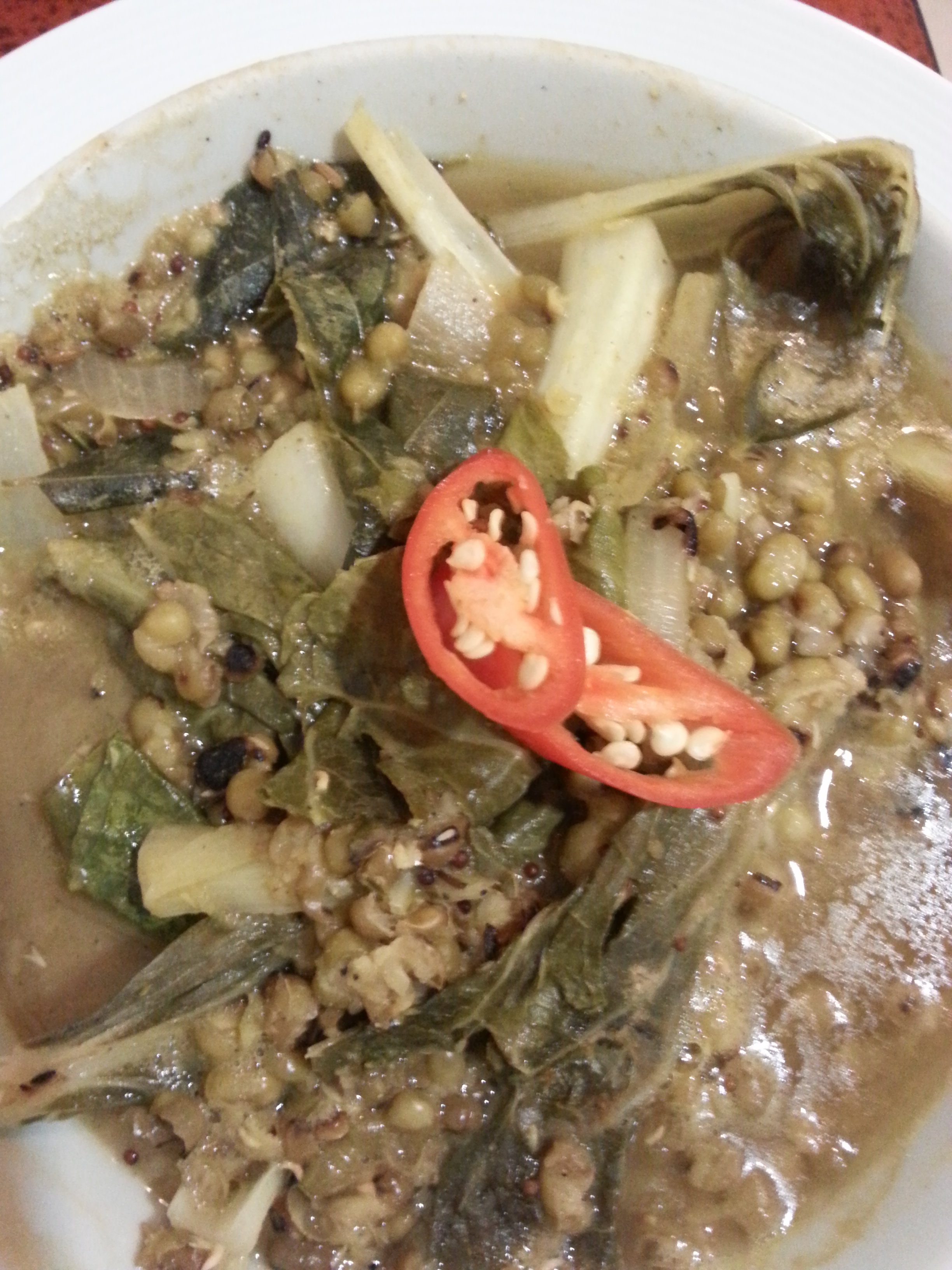 Add to the mung beans, which should be in a soupy liquid. Then add the rest of the ingredients and simmer gently until soft. To make it a one-pot meal I throw in some green veg with the other ingredients, and presto – there’s a meal in a bowl! Taste for seasoning, add coriander and serve in large soup bowls.