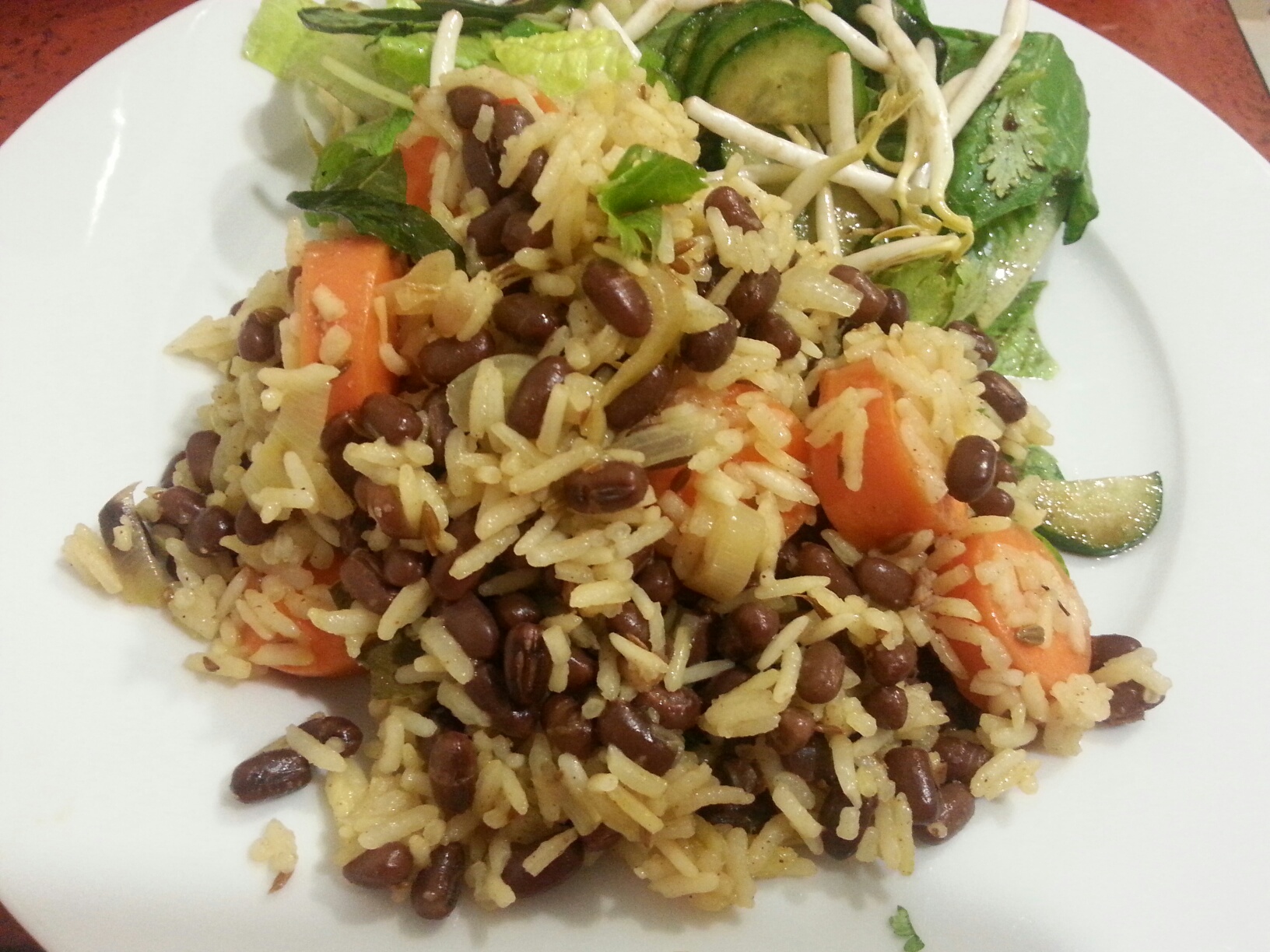 Wash the rice and add to the onion mixture, along with the cooked adukis beans, the chopped carrot and a couple of cups of water. Simmer the mixture over a low heat until the carrots and rice are all cooked. Check the seasoning and serve with a green salad or with some steamed vegetables. Hearty and delicious, and really quite easy to cook, despite the list of ingredients.